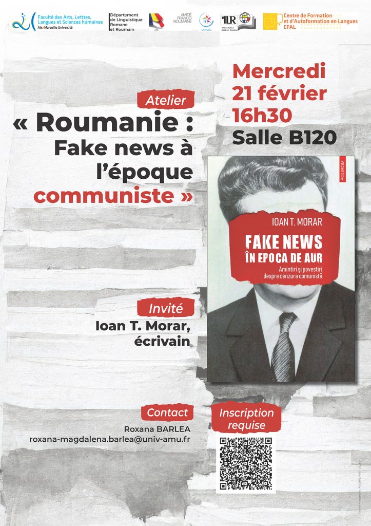Ioan T. Morar va participa miercuri, 21 februarie 2024 (ora 14.30, Sala B120) la un atelier cu studenți și cadre didactice, dedicat volumului Fake news în Epoca de Aur. Amintiri şi povestiri despre cenzura comunistă (Polirom, 2020), desfășurat la Facultatea de Arte, Litere, Limbi și Științe Umane – Departamentul de Lingvistică Romană și Română, din cadrul Universității Aix-Marsilia, Franța. Atelierul va fi moderat de Roxana Magdalena Bârlea.