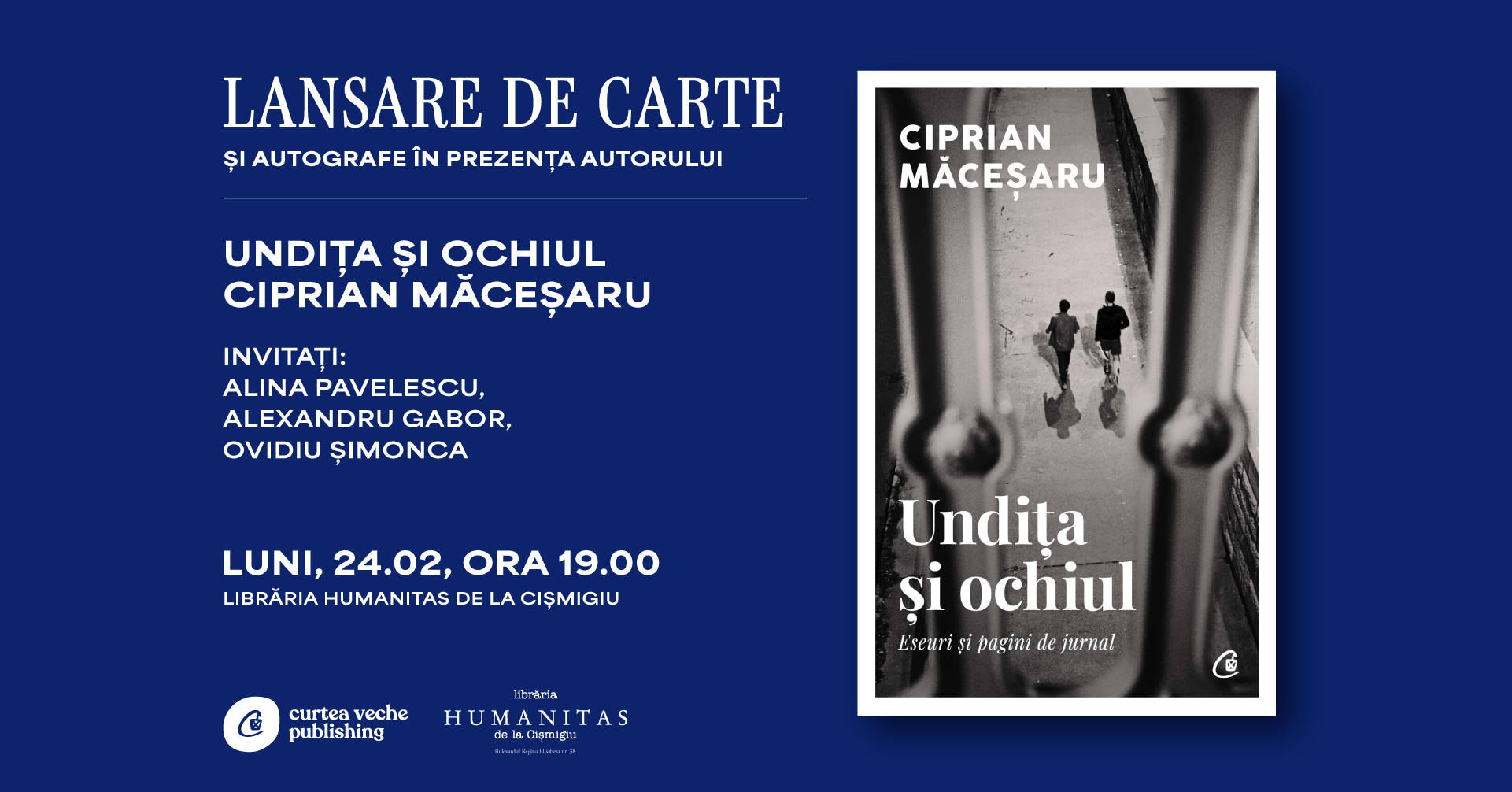 Curtea Veche Publishing lansează volumul „Undița și ochiul“ de Ciprian Măceșaru luni, 24 februarie, de la ora 19.00, la Librăria Humanitas de la Cișmigiu. Împreună cu autorul, Ciprian Măceșaru, vor prezenta cartea: Alina Pavelescu, Alexandru Gabor, Ovidiu Șimonca. În cadrul lansării, se va organiza un interval de întrebări și răspunsuri cu cititorii și o sesiune de autografe.