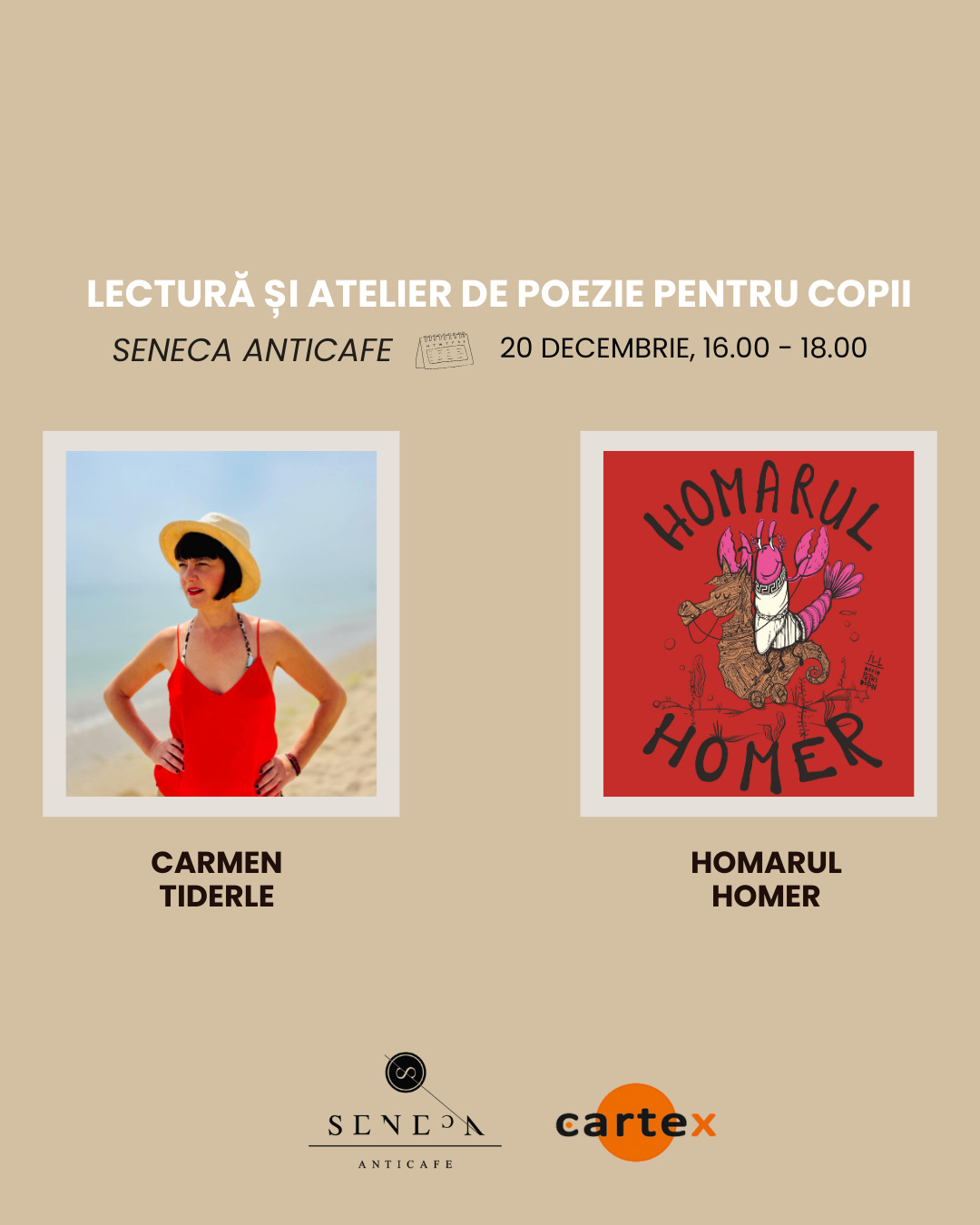 Vă invităm la Seneca Anticafe pe 20 decembrie, între orele 13.00 – 14.30 pentru o întâlnire cu Carmen Tiderle. Vă propunem o lectură publică din Homarul Homer, cea mai recentă carte a sa, precum și un atelier de poezie pentru copii.