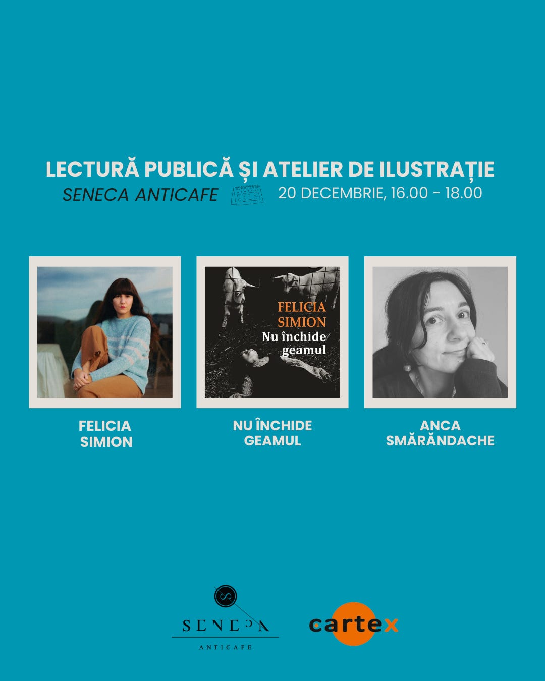 Vă invităm la Seneca Anticafe (Strada Arhitect Ion Mincu nr. 1, București) pe 20 decembrie, între orele 13.00 – 14.30 și 16.00 – 18.00 pentru evenimente Cartex: o întâlnire cu Carmen Tiderle și Homarul Homer (cu atelier de poezie pentru copii) și o lectură publică din Nu închide geamul de Felicia Simion, cu un atelier de ilustrație pentru copii ținut de Anca Smărăndache. Evenimentele se adresează atât părinților, cât și copiilor. Vă așteptăm! 🙂