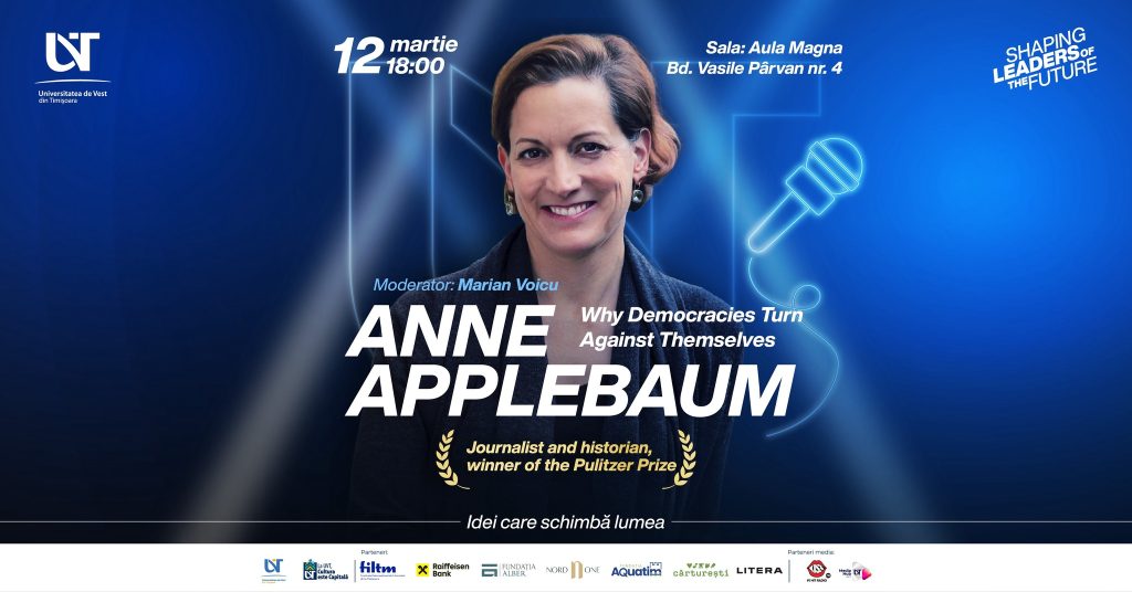 Joi, 12 martie, ora 18.00, la invitația Universității de Vest din Timișoara, Anne Applebaum se va afla într-un dialog cu jurnalistul Marian Voicu. Evenimentul, intitulat Why Democracies Turn Against Themselves și desfășurat în Aula Magna a Universității de Vest din Timișoara (Bld. Vasile Pârvan nr.4), propune o analiză lucidă asupra fragilității democrațiilor contemporane, ascensiunii autoritarismului și responsabilității societăților libere într-un context internațional marcat de tensiuni și transformări profunde.