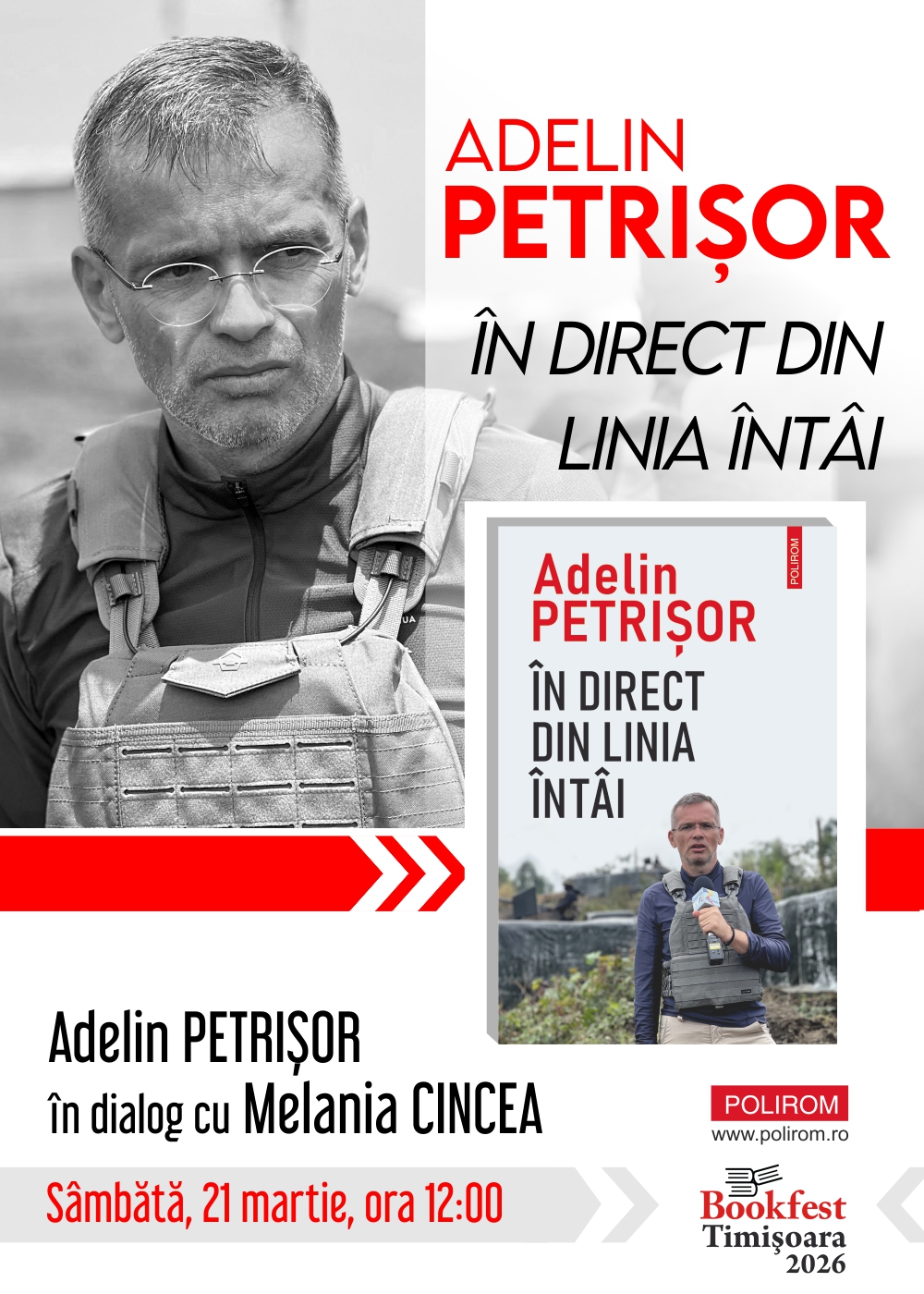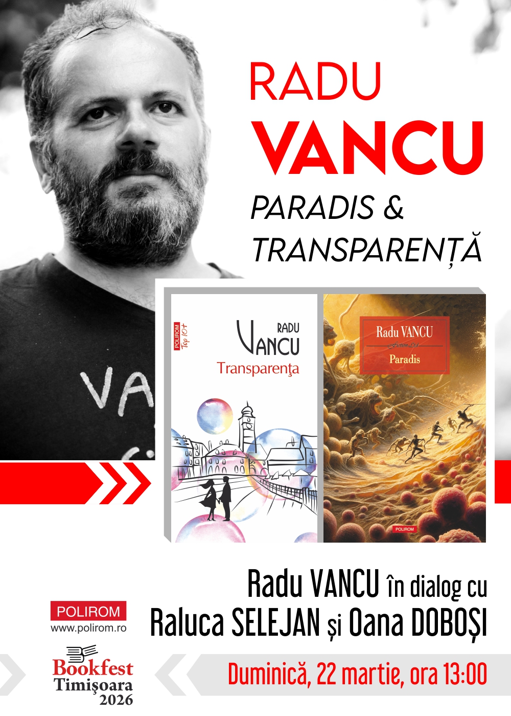 Sâmbătă, 21 martie, îl puteți întâlni pe Adelin Petrișor într-un dialog cu Melania Cincea, iar duminică, 22 martie, Radu Vancu își așteaptă cititorii timișoreni alături de Raluca Selejan și Oana Doboși.