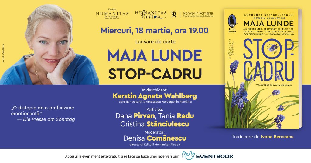 Vă invităm miercuri, 18 martie, de la 19.00, la Librăria Humanitas de la Cișmigiu, la lansarea romanului Stop-cadru de scriitoarea norvegiană Maja Lunde, apărut la Editura Humanitas Fiction, în colecția Raftul Denisei, în traducerea Ivonei Berceanu.