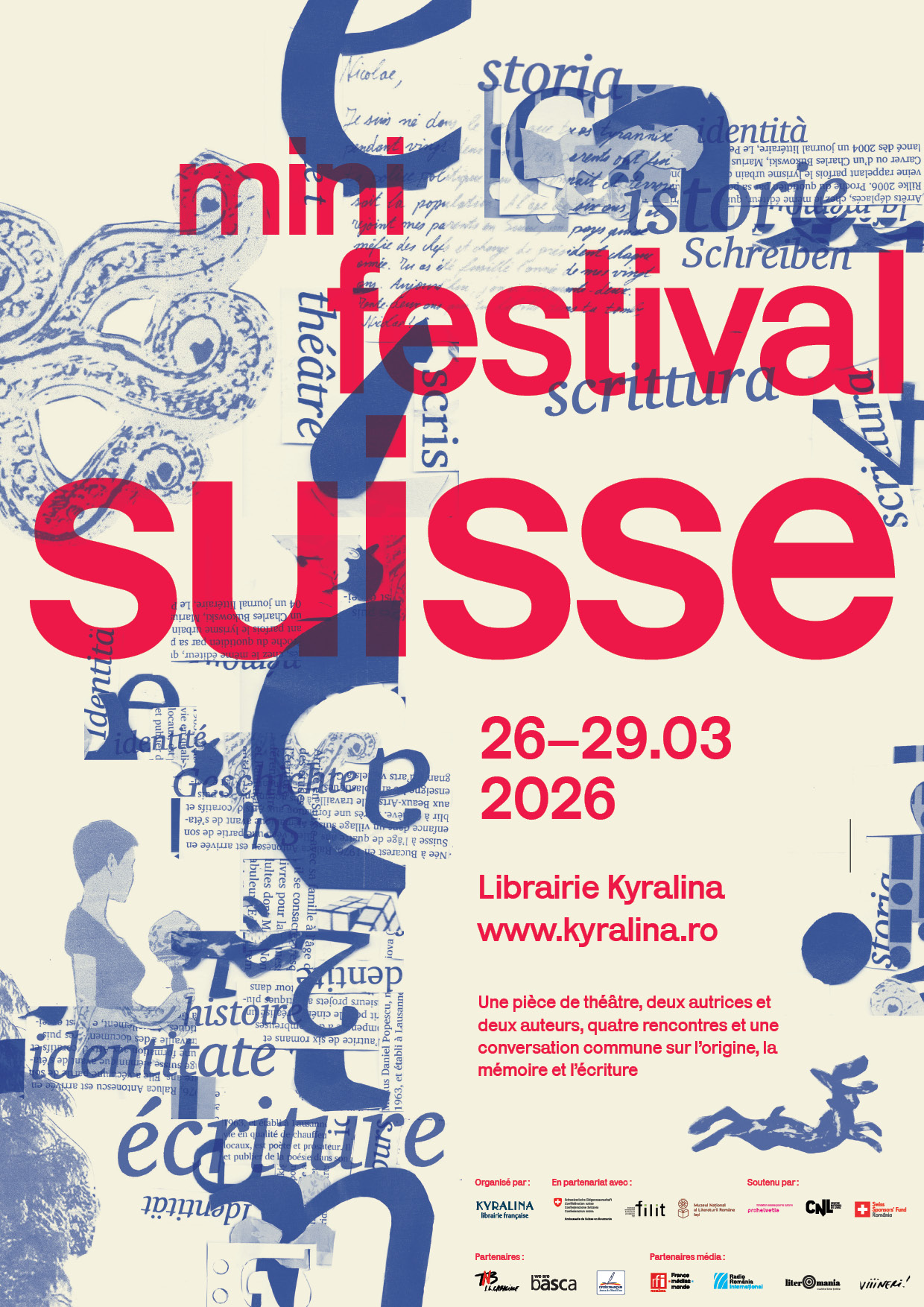 Alegerea invitaților și a temelor festivalului elvețian sunt realizate de librăria Kyralina în parteneriat cu Festivalul Internațional de Literatură și Traducere Iași – FILIT, un program al Muzeului Național al Literaturii Române Iași, unul dintre cele mai importante festivaluri literare din Europa.